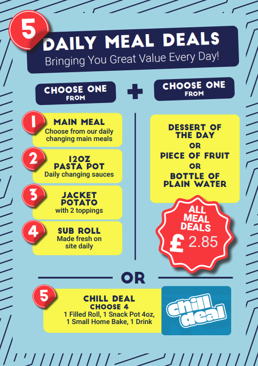 We want to ensure that all of our customers have access to a healthy nutritious meal, with this in mind, we have some meal deals in place. These include the hot main meal offer, a hot wrap or hot chefs special with a hot dessert.